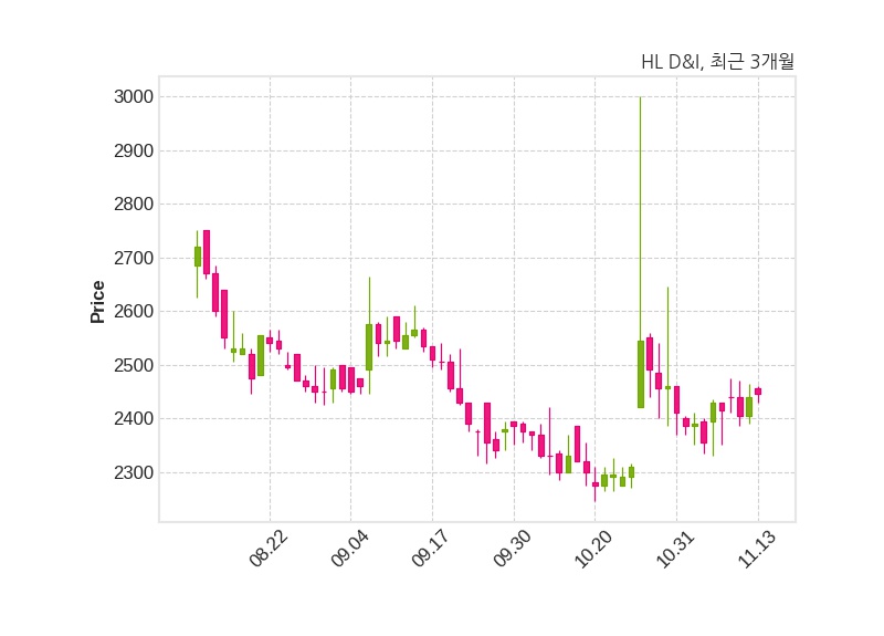 한편, HL D&I은 장 마감 이후 해당 기업공시를 발표했으며 오늘 종가가 2,445원, 거래량은 52,583주로, 직전 거래일 대비 5원(+0.2%) 상승했다.