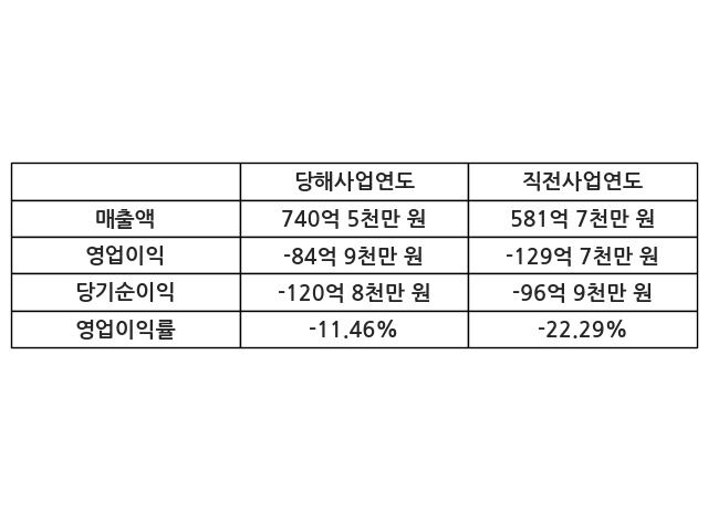 이번사업연도의 매출액은 직전사업연도 대비 27.3% 증가한 740억 5천만 원, 영업이익은 -84억 9천만 원, 당기순이익은 -120억 8천만 원이라고 공시했다.