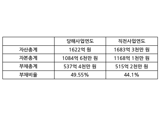 또한, 이번사업연도의 자산총계는 1622억 원으로 직전사업연도 대비 -3.64% 감소한 한편, 부채총계는 537억 4천만 원으로 4.31% 증가, 자본총계는 1084억 6천만 원으로 -7.15% 감소했다.