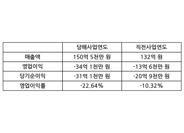 이번사업연도의 매출액은 직전사업연도 대비 14.04% 증가한 150억 5천만 원, 영업이익은 -34억 1천만 원, 당기순이익은 -31억 1천만 원이라고 공시했다.
