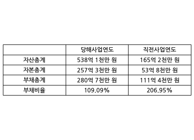 또한, 이번사업연도의 자산총계는 538억 1천만 원으로 직전사업연도 대비 225.75% 증가한 한편, 부채총계는 280억 7천만 원으로 152.08% 증가, 자본총계는 257억 3천만 원으로 378.21% 증가했다.