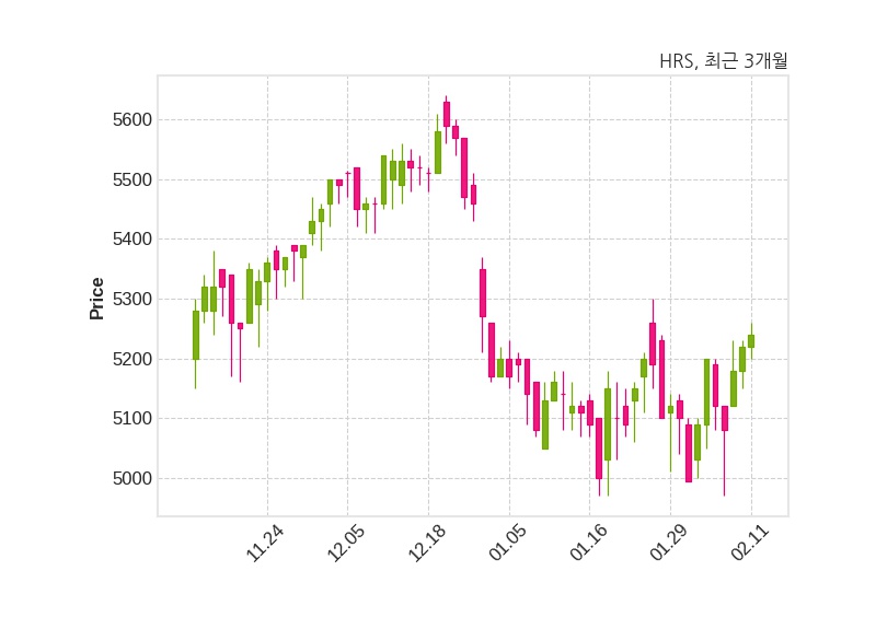 한편, HRS의 14시 40분 현재주가는 5,240원으로 직전 거래일 대비 20원(+0.38%) 상승이며, 거래량은 106,355주이다.