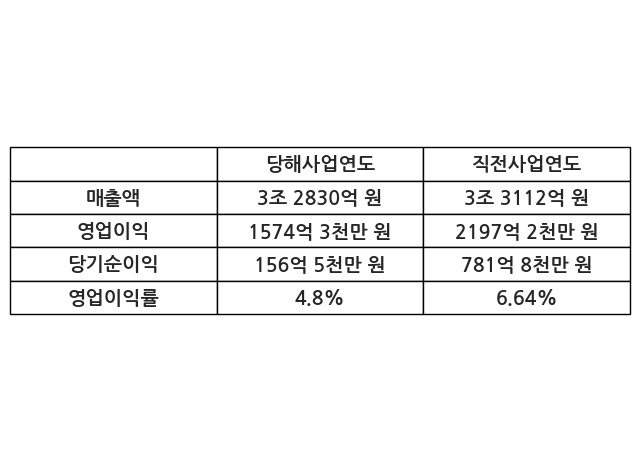 이번사업연도의 매출액은 직전사업연도 대비 -0.85% 감소한 3조 2830억 원, 영업이익은 1574억 3천만 원, 당기순이익은 156억 5천만 원이라고 공시했다.