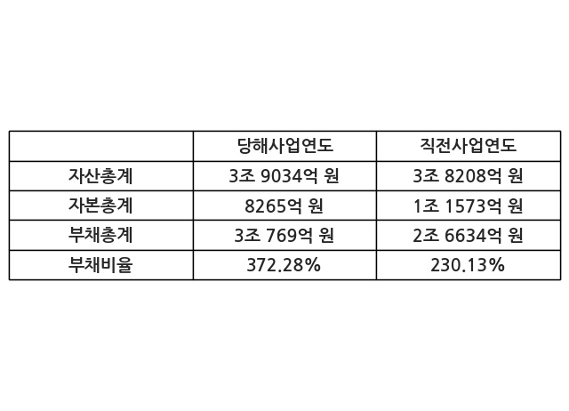 또한, 이번사업연도의 자산총계는 3조 9034억 원으로 직전사업연도 대비 2.16% 증가한 한편, 부채총계는 3조 769억 원으로 15.52% 증가, 자본총계는 8265억 원으로 -28.59% 감소했다.