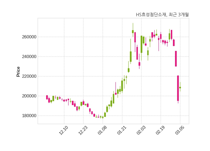 한편, HS효성첨단소재는 장 마감 이후 해당 기업공시를 발표했으며 오늘 종가가 209,000원, 거래량은 25,783주로, 직전 거래일 대비 13,700원(+7.01%) 상승했다.