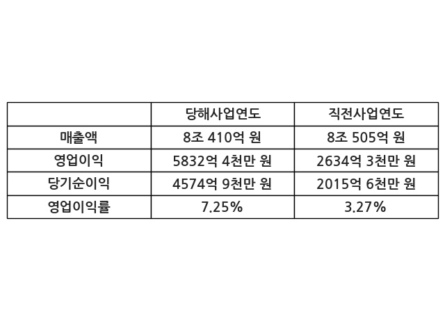 이번사업연도의 매출액은 직전사업연도 대비 -0.12% 감소한 8조 410억 원, 영업이익은 5832억 4천만 원, 당기순이익은 4574억 9천만 원이라고 공시했다.