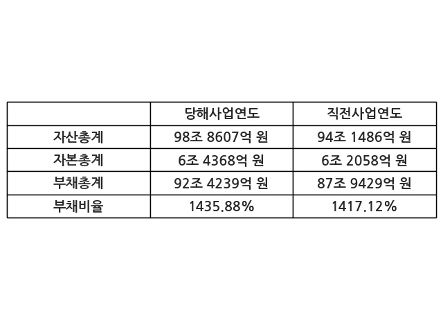 또한, 이번사업연도의 자산총계는 98조 8607억 원으로 직전사업연도 대비 5.0% 증가한 한편, 부채총계는 92조 4239억 원으로 5.1% 증가, 자본총계는 6조 4368억 원으로 3.72% 증가했다.