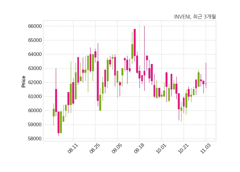 한편, INVENI의 14시 34분 현재주가는 61,900원으로 직전 거래일 대비 변동없으며, 거래량은 4,467주이다.