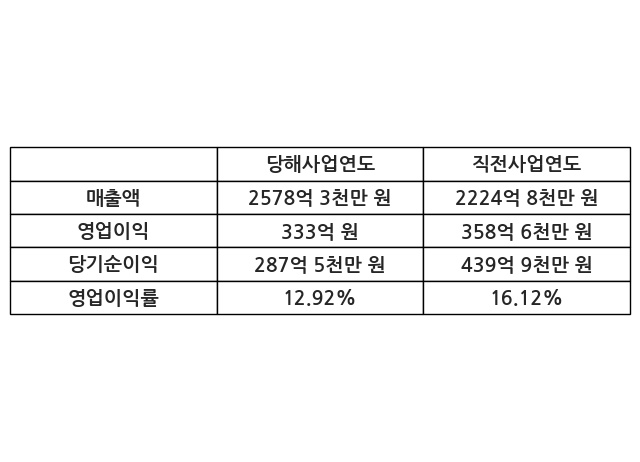 이번사업연도의 매출액은 직전사업연도 대비 15.89% 증가한 2578억 3천만 원, 영업이익은 333억 원, 당기순이익은 287억 5천만 원이라고 공시했다.
