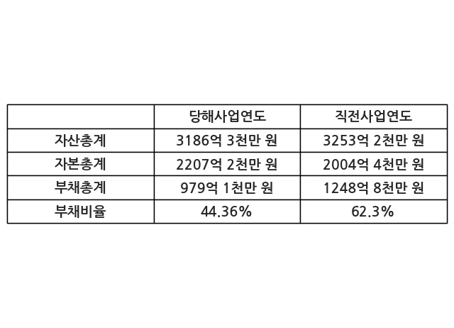 또한, 이번사업연도의 자산총계는 3186억 3천만 원으로 직전사업연도 대비 -2.06% 감소한 한편, 부채총계는 979억 1천만 원으로 -21.6% 감소, 자본총계는 2207억 2천만 원으로 10.12% 증가했다.