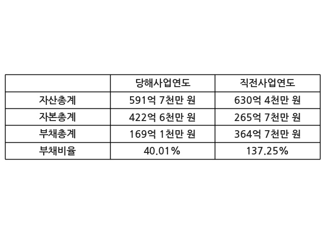 또한, 이번사업연도의 자산총계는 591억 7천만 원으로 직전사업연도 대비 -6.14% 감소한 한편, 부채총계는 169억 1천만 원으로 -53.63% 감소, 자본총계는 422억 6천만 원으로 59.05% 증가했다.