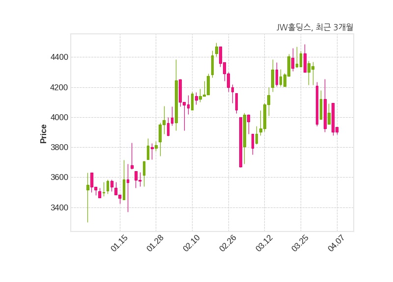 한편, JW홀딩스의 09시 44분 현재주가는 3,900원으로 직전 거래일 대비 변동없으며, 거래량은 10,091주이다.