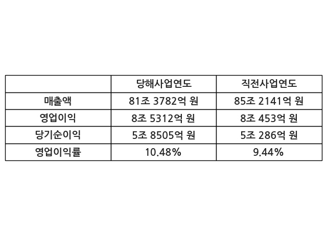 이번사업연도의 매출액은 직전사업연도 대비 -4.5% 감소한 81조 3782억 원, 영업이익은 8조 5312억 원, 당기순이익은 5조 8505억 원이라고 공시했다.