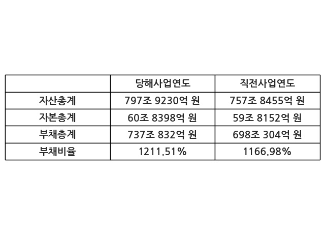 또한, 이번사업연도의 자산총계는 797조 9230억 원으로 직전사업연도 대비 5.29% 증가한 한편, 부채총계는 737조 832억 원으로 5.59% 증가, 자본총계는 60조 8398억 원으로 1.71% 증가했다.