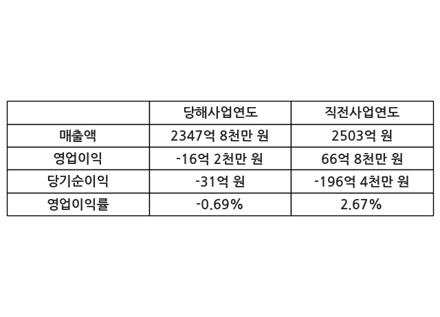 이번사업연도의 매출액은 직전사업연도 대비 -6.2% 감소한 2347억 8천만 원, 영업이익은 -16억 2천만 원, 당기순이익은 -31억 원이라고 공시했다.