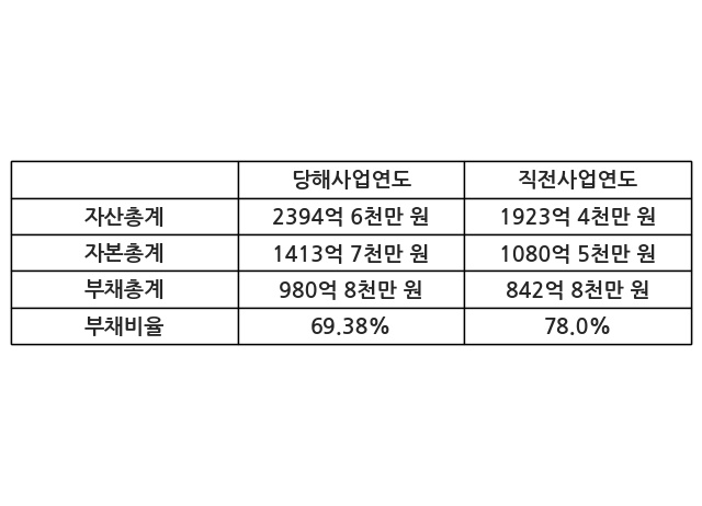 또한, 이번사업연도의 자산총계는 2394억 6천만 원으로 직전사업연도 대비 24.5% 증가한 한편, 부채총계는 980억 8천만 원으로 16.37% 증가, 자본총계는 1413억 7천만 원으로 30.84% 증가했다.