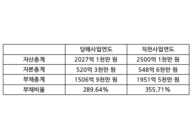 또한, 이번사업연도의 자산총계는 2027억 1천만 원으로 직전사업연도 대비 -18.92% 감소한 한편, 부채총계는 1506억 9천만 원으로 -22.78% 감소, 자본총계는 520억 3천만 원으로 -5.17% 감소했다.