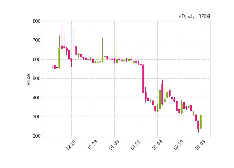 한편, KD은 장 마감 이후 해당 기업공시를 발표했으며 오늘 종가가 309원, 거래량은 2,636,359주로, 직전 거래일 대비 71원(+29.83%) 상승했다.