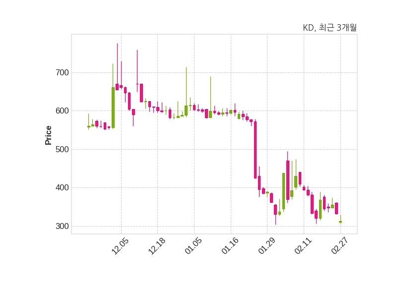 한편, KD은 장 마감 이후 해당 기업공시를 발표했으며 오늘 종가가 312원, 거래량은 1,012,018주로, 직전 거래일 대비 20원(-6.02%) 하락했다.