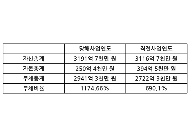 또한, 이번사업연도의 자산총계는 3191억 7천만 원으로 직전사업연도 대비 2.41% 증가한 한편, 부채총계는 2941억 3천만 원으로 8.05% 증가, 자본총계는 250억 4천만 원으로 -36.52% 감소했다.