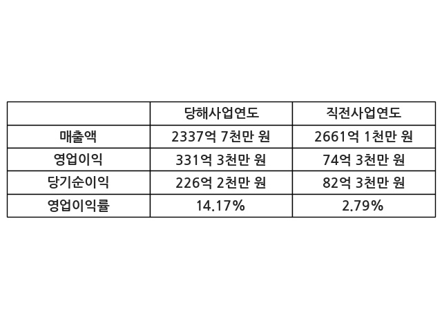 이번사업연도의 매출액은 직전사업연도 대비 -12.15% 감소한 2337억 7천만 원, 영업이익은 331억 3천만 원, 당기순이익은 226억 2천만 원이라고 공시했다.