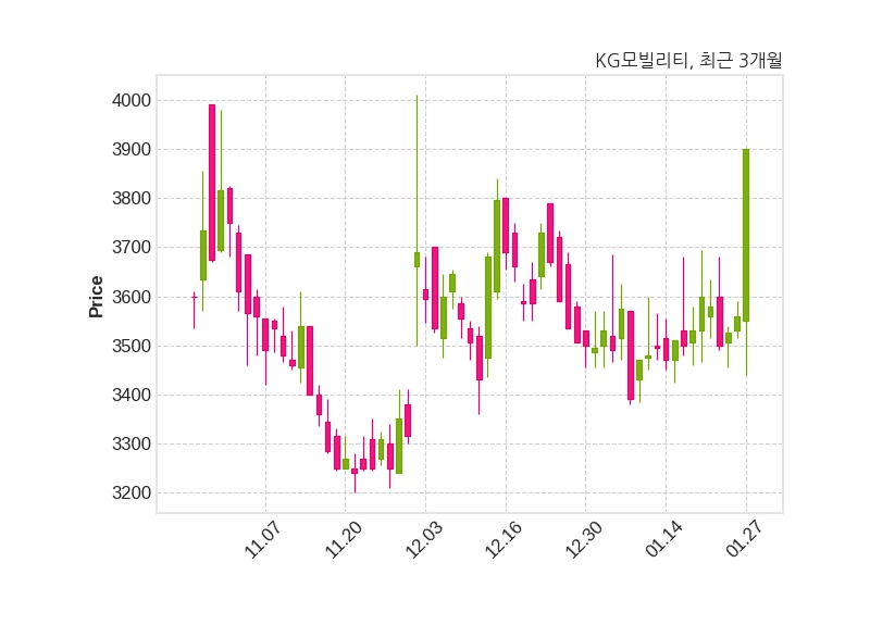 한편, KG모빌리티의 13시 49분 현재주가는 3,900원으로 직전 거래일 대비 340원(+9.55%) 상승이며, 거래량은 1,214,956주이다.