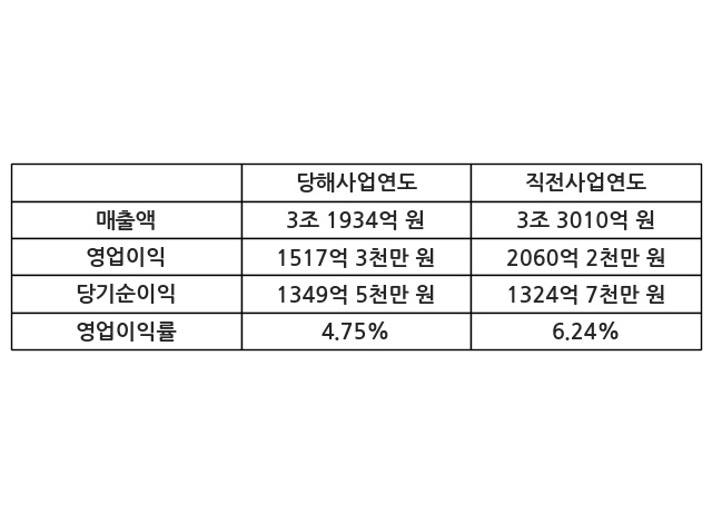 이번사업연도의 매출액은 직전사업연도 대비 -3.26% 감소한 3조 1934억 원, 영업이익은 1517억 3천만 원, 당기순이익은 1349억 5천만 원이라고 공시했다.