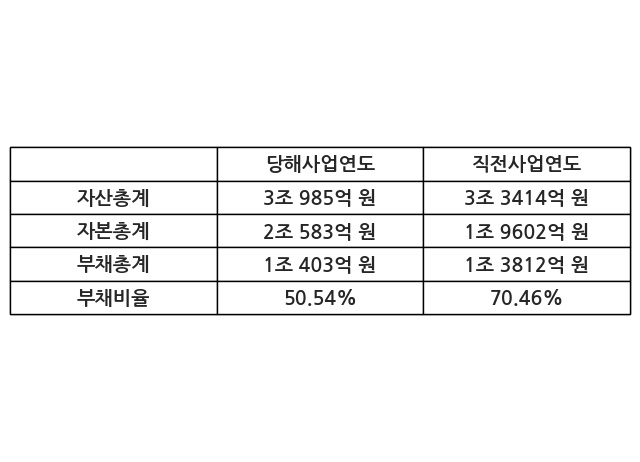 또한, 이번사업연도의 자산총계는 3조 985억 원으로 직전사업연도 대비 -7.27% 감소한 한편, 부채총계는 1조 403억 원으로 -24.68% 감소, 자본총계는 2조 583억 원으로 5.0% 증가했다.