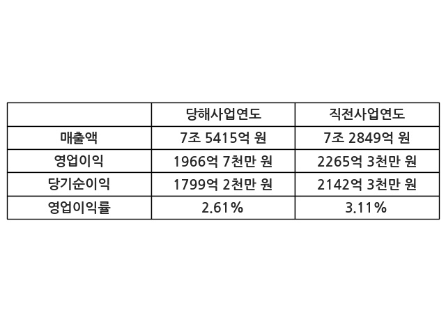 이번사업연도의 매출액은 직전사업연도 대비 3.52% 증가한 7조 5415억 원, 영업이익은 1966억 7천만 원, 당기순이익은 1799억 2천만 원이라고 공시했다.