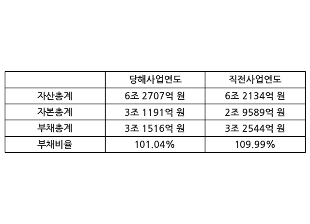 또한, 이번사업연도의 자산총계는 6조 2707억 원으로 직전사업연도 대비 0.92% 증가한 한편, 부채총계는 3조 1516억 원으로 -3.16% 감소, 자본총계는 3조 1191억 원으로 5.41% 증가했다.