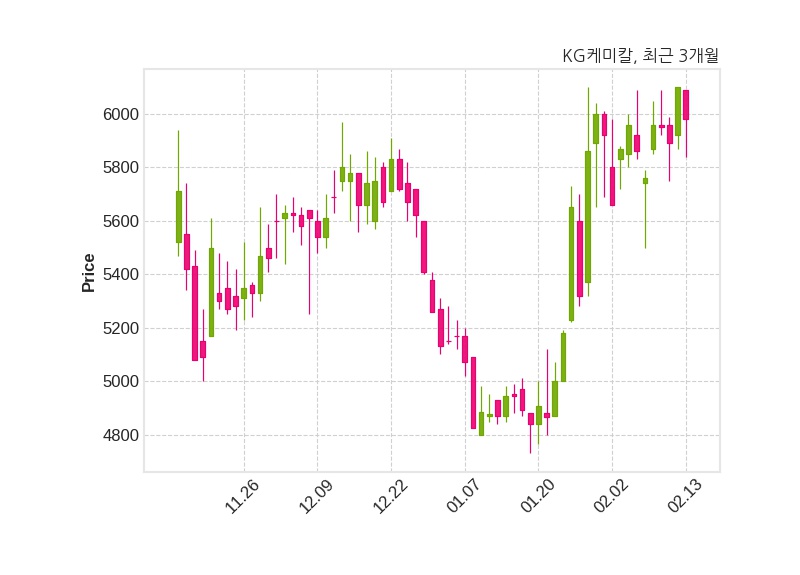 한편, KG케미칼은 장 마감 이후 해당 기업공시를 발표했으며 오늘 종가가 5,980원, 거래량은 324,702주로, 직전 거래일 대비 120원(-1.97%) 하락했다.