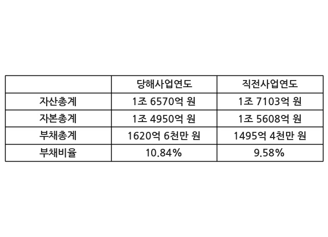 또한, 이번사업연도의 자산총계는 1조 6570억 원으로 직전사업연도 대비 -3.11% 감소한 한편, 부채총계는 1620억 6천만 원으로 8.37% 증가, 자본총계는 1조 4950억 원으로 -4.21% 감소했다.