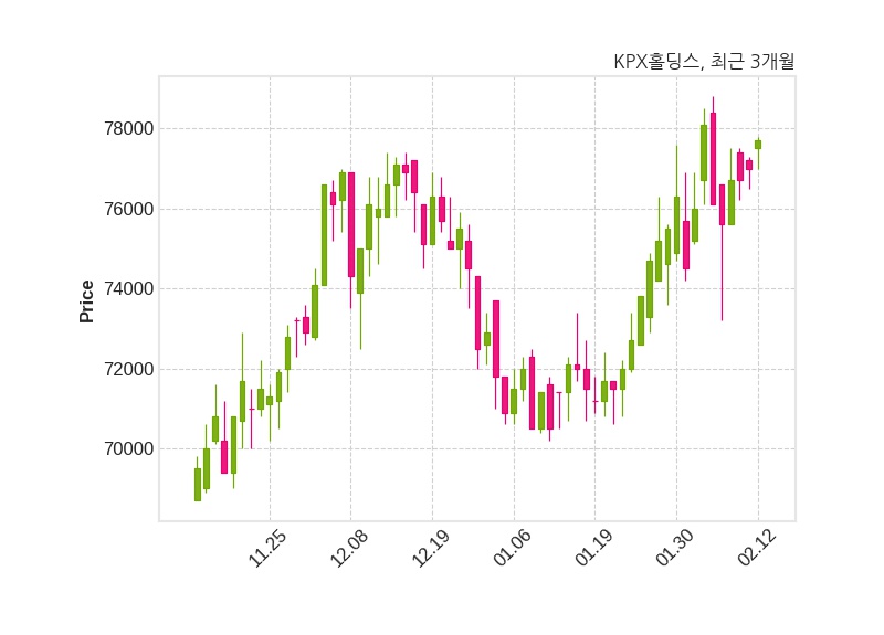 한편, KPX홀딩스는 장 마감 이후 해당 기업공시를 발표했으며 오늘 종가가 77,700원, 거래량은 1,271주로, 직전 거래일 대비 700원(+0.91%) 상승했다.