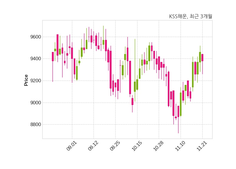 한편, KSS해운은 장 마감 이후 해당 기업공시를 발표했으며 오늘 종가가 9,380원, 거래량은 29,966주로, 직전 거래일 대비 80원(-0.85%) 하락했다.