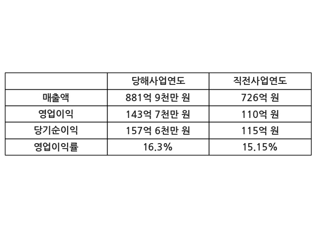 이번사업연도의 매출액은 직전사업연도 대비 21.48% 증가한 881억 9천만 원, 영업이익은 143억 7천만 원, 당기순이익은 157억 6천만 원이라고 공시했다.