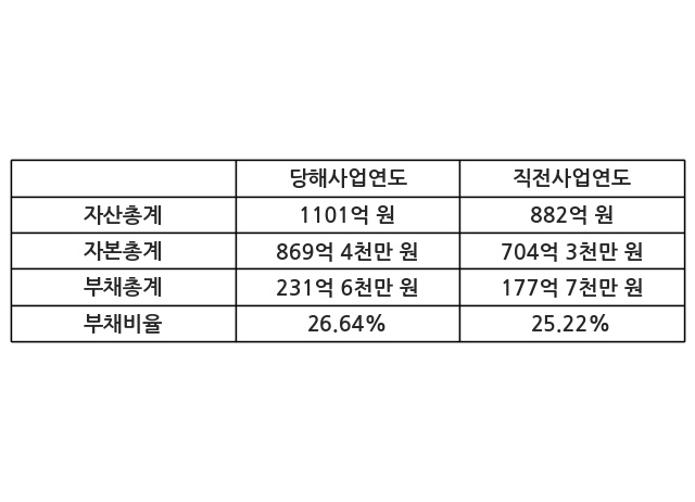 또한, 이번사업연도의 자산총계는 1101억 원으로 직전사업연도 대비 24.83% 증가한 한편, 부채총계는 231억 6천만 원으로 30.37% 증가, 자본총계는 869억 4천만 원으로 23.43% 증가했다.
