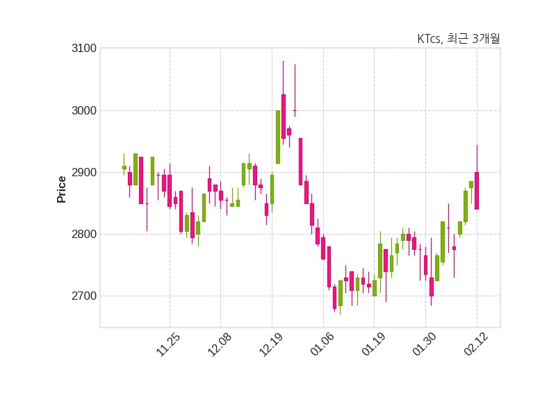 한편, KTcs은 장 마감 이후 해당 기업공시를 발표했으며 오늘 종가가 2,840원, 거래량은 950,710주로, 직전 거래일 대비 45원(-1.56%) 하락했다.