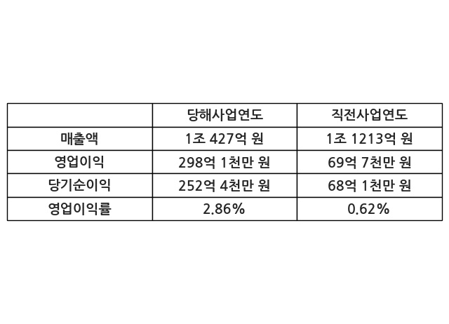 이번사업연도의 매출액은 직전사업연도 대비 -7.01% 감소한 1조 427억 원, 영업이익은 298억 1천만 원, 당기순이익은 252억 4천만 원이라고 공시했다.
