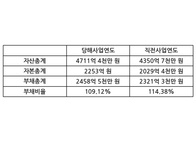 또한, 이번사업연도의 자산총계는 4711억 4천만 원으로 직전사업연도 대비 8.29% 증가한 한편, 부채총계는 2458억 5천만 원으로 5.91% 증가, 자본총계는 2253억 원으로 11.02% 증가했다.