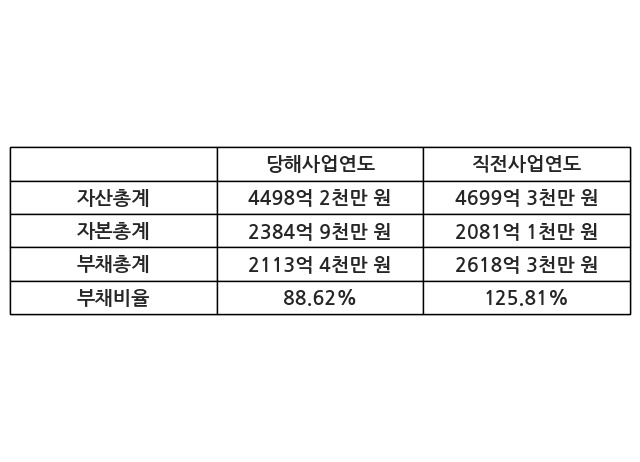 또한, 이번사업연도의 자산총계는 4498억 2천만 원으로 직전사업연도 대비 -4.28% 감소한 한편, 부채총계는 2113억 4천만 원으로 -19.28% 감소, 자본총계는 2384억 9천만 원으로 14.6% 증가했다.