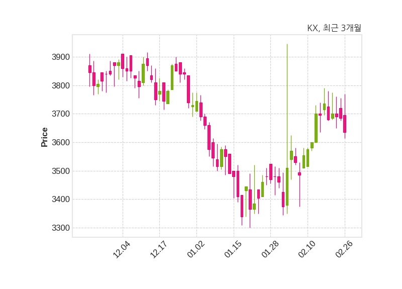 한편, KX은 장 마감 이후 해당 기업공시를 발표했으며 오늘 종가가 3,635원, 거래량은 145,331주로, 직전 거래일 대비 50원(-1.36%) 하락했다.