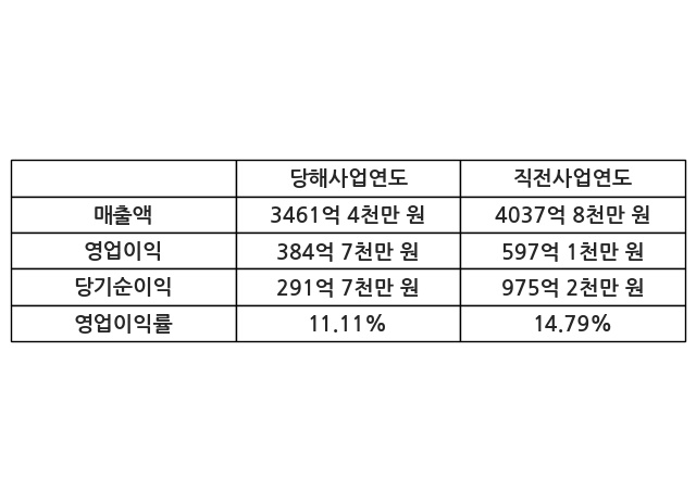 이번사업연도의 매출액은 직전사업연도 대비 -14.27% 감소한 3461억 4천만 원, 영업이익은 384억 7천만 원, 당기순이익은 291억 7천만 원이라고 공시했다.
