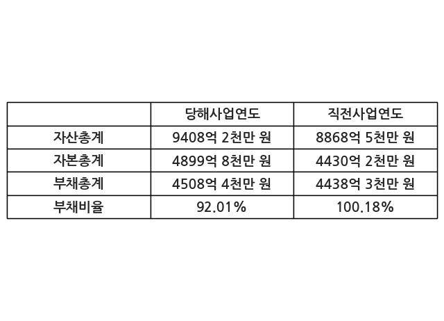 또한, 이번사업연도의 자산총계는 9408억 2천만 원으로 직전사업연도 대비 6.09% 증가한 한편, 부채총계는 4508억 4천만 원으로 1.58% 증가, 자본총계는 4899억 8천만 원으로 10.6% 증가했다.