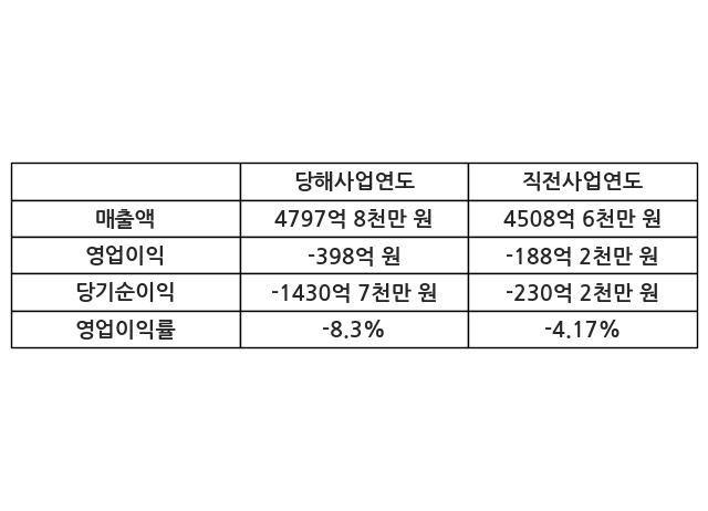 이번사업연도의 매출액은 직전사업연도 대비 6.41% 증가한 4797억 8천만 원, 영업이익은 -398억 원, 당기순이익은 -1430억 7천만 원이라고 공시했다.