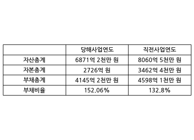 또한, 이번사업연도의 자산총계는 6871억 2천만 원으로 직전사업연도 대비 -14.75% 감소한 한편, 부채총계는 4145억 2천만 원으로 -9.85% 감소, 자본총계는 2726억 원으로 -21.27% 감소했다.