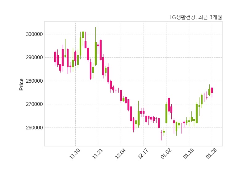 한편, LG생활건강은 장 마감 이후 해당 기업공시를 발표했으며 오늘 종가가 275,000원, 거래량은 69,386주로, 직전 거래일 대비 1,500원(-0.54%) 하락했다.