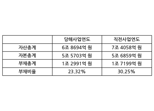 또한, 이번사업연도의 자산총계는 6조 8694억 원으로 직전사업연도 대비 -7.24% 감소한 한편, 부채총계는 1조 2991억 원으로 -24.47% 감소, 자본총계는 5조 5703억 원으로 -2.03% 감소했다.