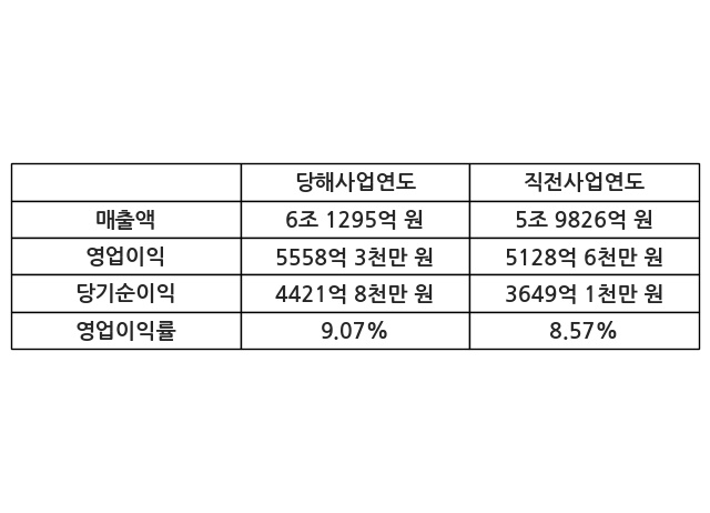 이번사업연도의 매출액은 직전사업연도 대비 2.46% 증가한 6조 1295억 원, 영업이익은 5558억 3천만 원, 당기순이익은 4421억 8천만 원이라고 공시했다.