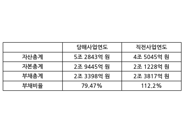 또한, 이번사업연도의 자산총계는 5조 2843억 원으로 직전사업연도 대비 17.31% 증가한 한편, 부채총계는 2조 3398억 원으로 -1.76% 감소, 자본총계는 2조 9445억 원으로 38.71% 증가했다.