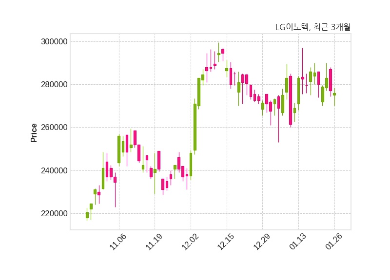 한편, LG이노텍은 장 마감 이후 해당 기업공시를 발표했으며 오늘 종가가 276,000원, 거래량은 168,716주로, 직전 거래일 대비 1,000원(-0.36%) 하락했다.